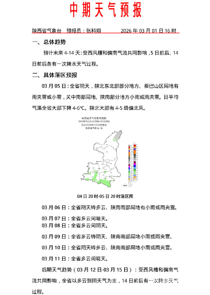 未来0-6小时:全省阴天。榆林南部、延安大部、铜川北部、咸阳北部、渭南北部、秦岭山区东段有小雪(0.1-3mm),其中榆林东南部、延安东部、渭南东北部局地有中雪(3-5mm)。铜川南部、咸阳南部、西安东部、渭南南部、商洛、安康北部.