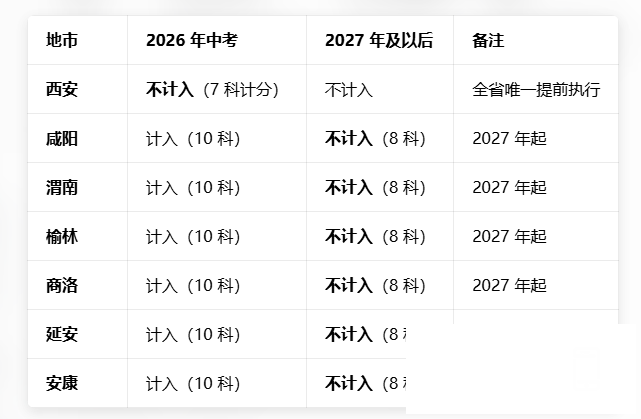 陕西省教育厅今年1月宣布,2026 年全省统一组织八年级生物、地理考试(各 60 分),是否计入中考总分由各市自行决定。