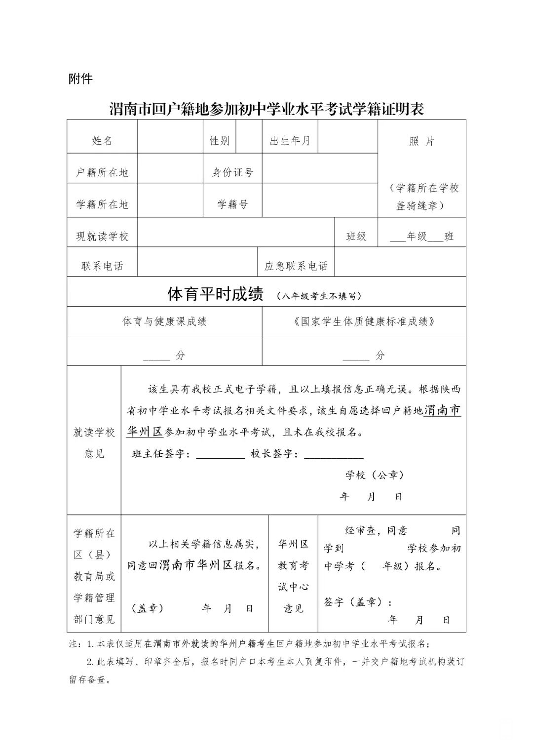 3.《渭南市回户籍地参加初中学业水平考试学籍证明表》(见附件)。